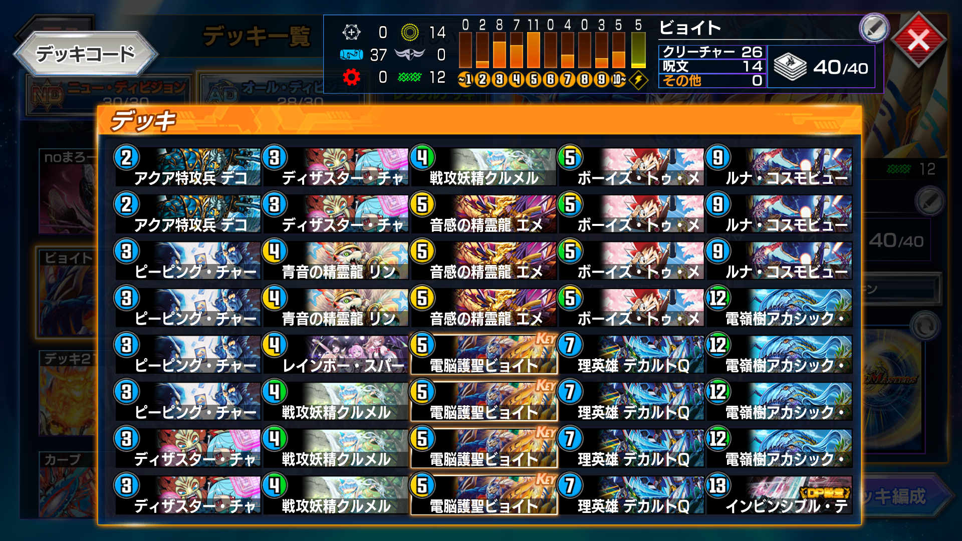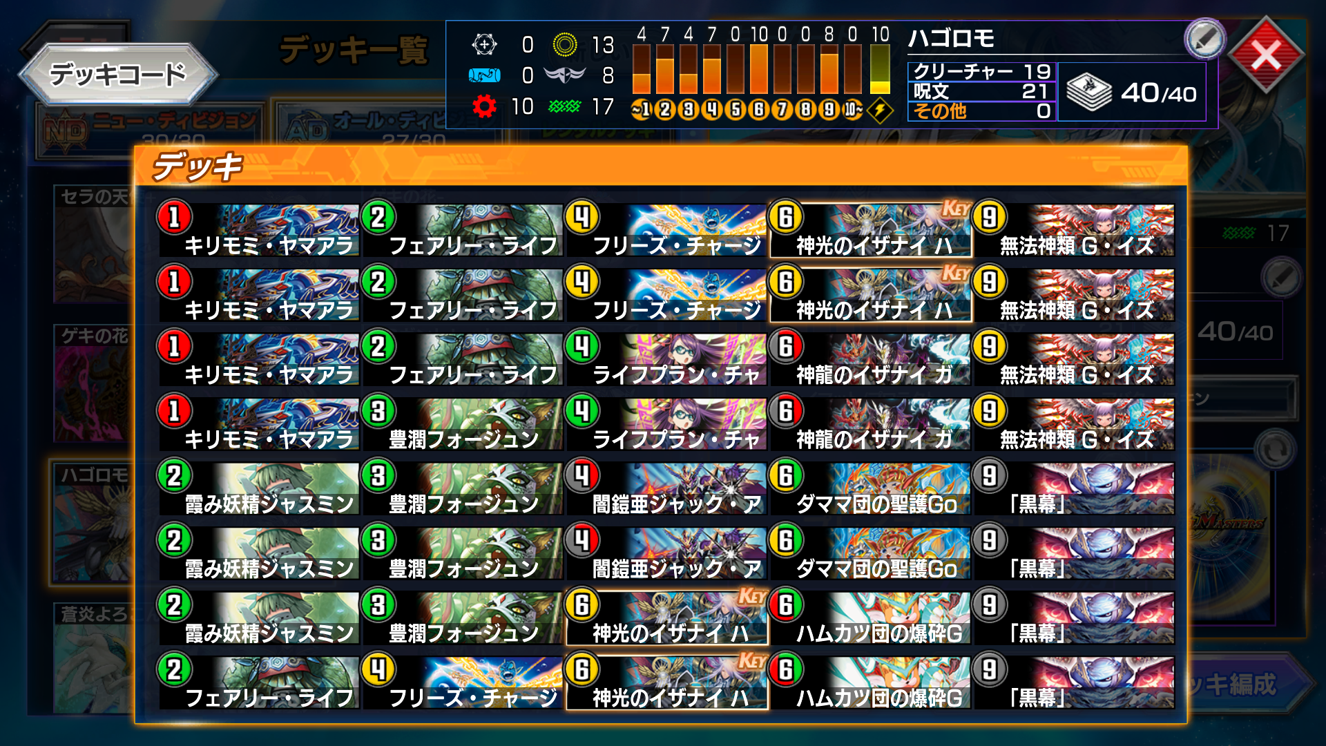 自分の最終形態は、《ズンドコ》タイプから《クルチャ》《マッハアーマー》を抜いたもの。 《ズンドコ》を貼るのであれば、《マッハアーマー》ではなくクリーチャーを出してマナを伸ばすほうが良いはず。 また、《ゲキ》から《デモナ》を吊ることで3マナ生まれるので、これを活かせばリンクもしくは他の行動が取れるだろうという目算。