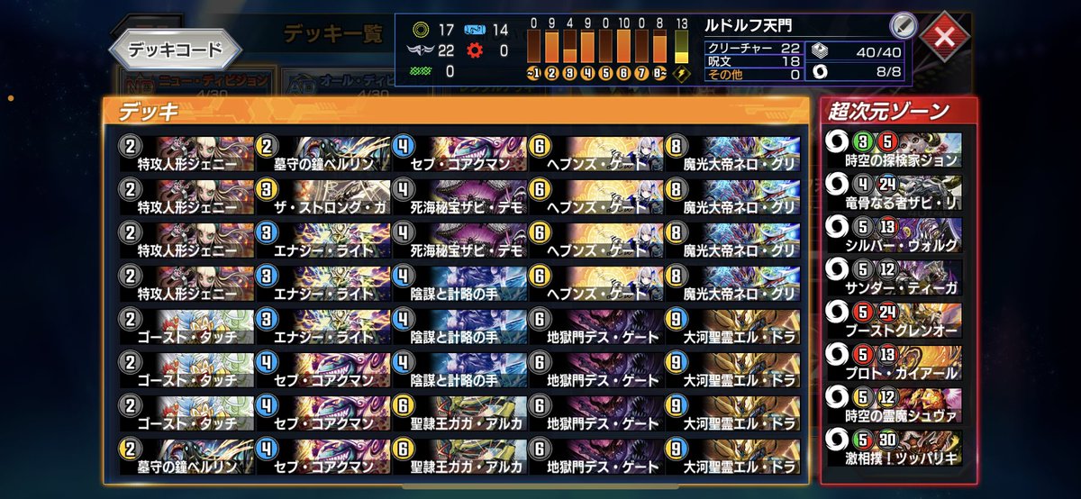 【ドロマールドルフ天門】は、《ヘブンズ・ゲート》再録により復活した天門系のデッキ。 《ヘブンズ》再録前も細々と研究されるくらいには可能性を秘めていた《ルドルフ》が、ここに来て花開いた。 久しぶりの【天門】ということで使用者も多い。 攻撃を誘発してトリガーをプレイできる《エル・ドラード》との相性は抜群。 《バースター》《デモナ》、《デス・ゲート》からの《特攻ジェニー》で《ルドルフ》の効果を起動できる。 というか《エル・ドラード》ってカードが強すぎる。