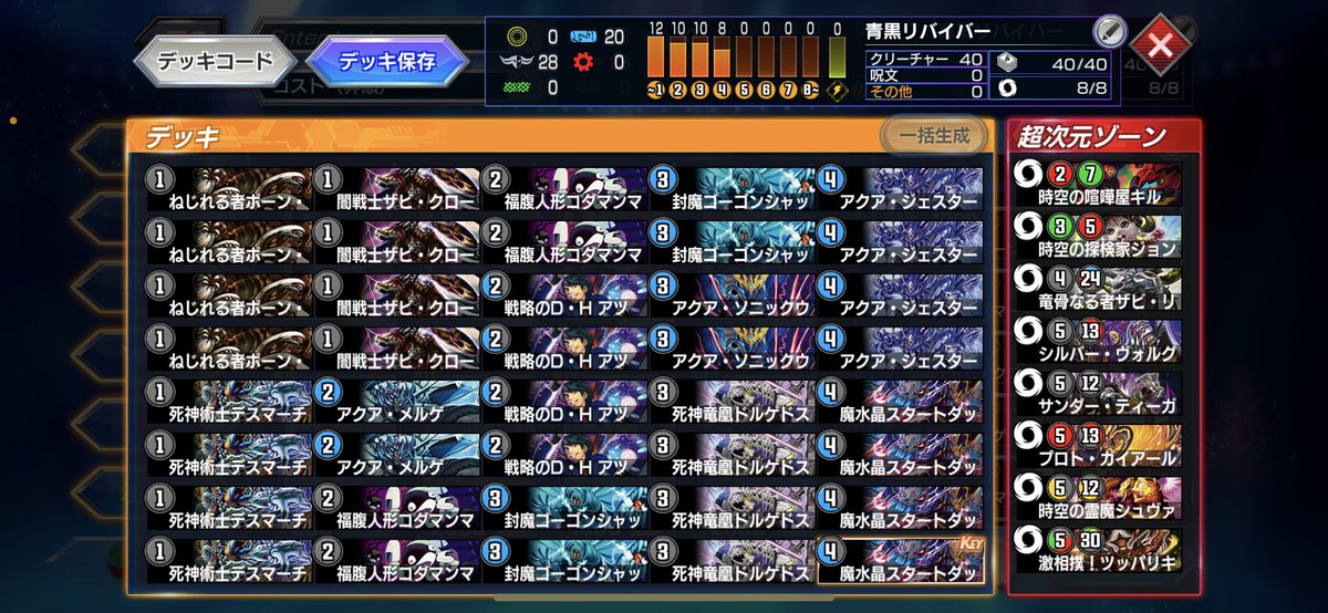 また、途中から勢力を伸ばしたのが【青黒リバイバー】。 《ザビ・クロー》と《アツト》を招き入れた、継戦能力高めの墓地進化速攻デッキである。 環境がごちゃついたところで、【刃】のような遅いデッキを狩って勢力を伸ばしている。 実は【白Nエクス】には、16弾環境で多量投入されていた《スクラッパー》を積むスペースが無い。 当然《ホワグリ》《リュウホ》は死ぬほどキツいが、弱点の火力除去が無いおかげでなんとか立ち回れる。
