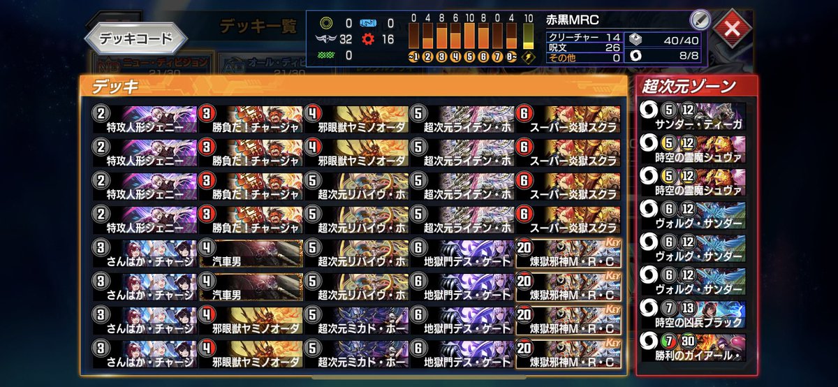 【MRC】は《ヴォルグ・サンダー》を筆頭にまたしても強化を得た。 【白Nエクス】が《N》を《大地》で回してくる動きこそしんどいが、未だ環境での強さは衰えない。 瞬間的に墓地を肥やす《ヴォルグ》によって、構築は激変。 これまで必須だった《ベリアル》《プライマル》《ヤミノオーダー》すら採用が確定しなかったり、まさかの《スパーク》が入ったりしている。 《オレドラゴン》《絶体絶命》《ヴォルグ・ティーガー》など、フィニッシュの選択肢も増えている。 構築もプレイングもますますバリエーションが増え、より難解なデッキへと進化した。