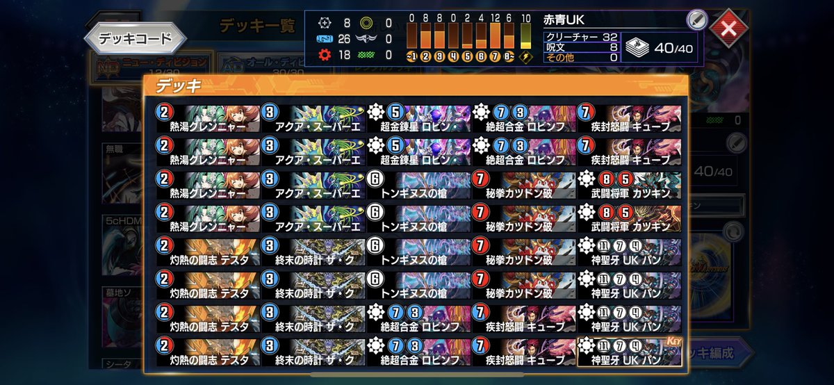 環境中期には【赤青UKパンク】が成立。 《ドン破》から《UK》が実質的に直接出る動きが強力。カウンタープランを太く取ったコンボ内包ビートである。 《トンギヌスの槍》で相手への干渉能力、トリガーケア能力も備えている。 ビートでありながら速度が出ないため、ビッグマナ系統には不利がつく。