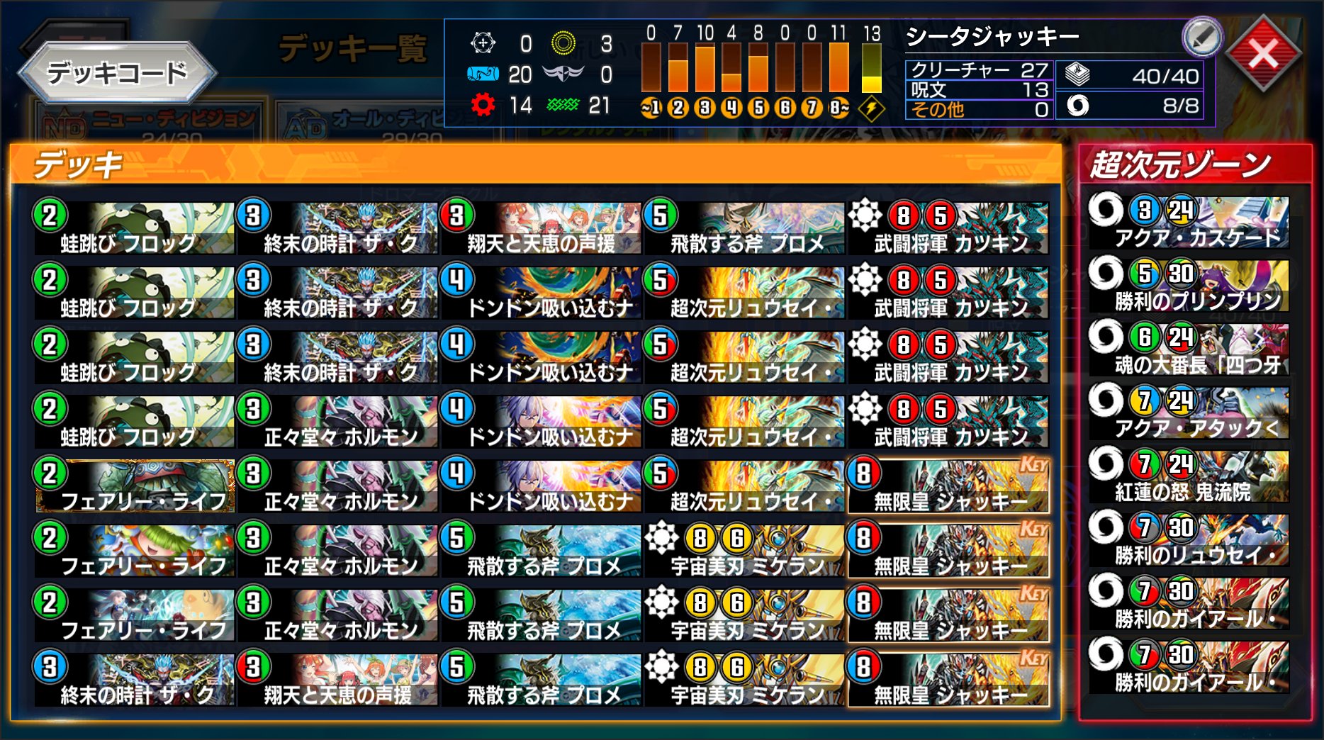【シータ/4cジャッキー】は、赤青型の脆さをカバーするべく開発された安定型。 《ホルモン》をはじめ、《プロメテウス》《ドン・カツドン》できちんとマナを伸ばすことで、軽減に失敗しても動けるようにしている。 サブプランは主に《カツキング》。白入りは《スパーク》《ミケランジェロ》で受けが強くなる。 自由度が高すぎてテンプレが全然定まっていない印象。 《ドン破》《UK》《キンジ》《リュウセイ・ホール》《スパーク》《クロック》の枚数など、人によって構築が違う。 表記コストの高いドロンゴーが多く積まれるため、実はガチンコジャッジにちょっと強めだったりする。